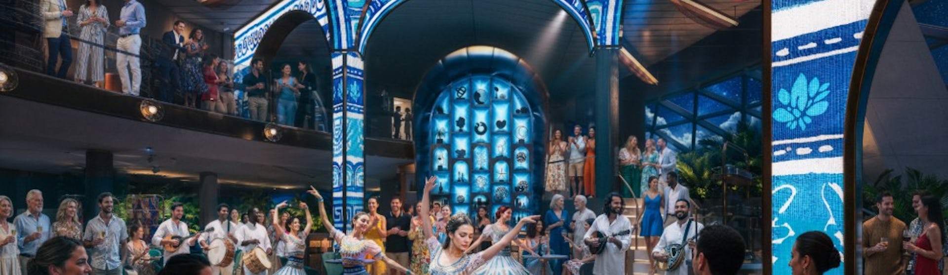 Een meeslepende viering die het hart en de ziel van Griekenland vastlegt met hands-on ervaringen, levendige cultuur en onvergetelijk entertainment. Stap in een bruisende markt waar de lucht gevuld is met de geur van sissende souvlaki en het geluid van bouzouki-muziek. Snack op gyros en loukoumades, drink ouzo en maak uw eigen boze-oog-bedeltje. Leer Griekse zinnen, dans de Sirtaki en shop kunst en accessoires geïnspireerd op mythes. Wanneer de avond valt, serveert Mosaic een feestmaal van Mediterrane smaken terwijl ABBA-anthems de lucht vullen. Servetten vliegen, borden breken en dansers springen van tafels in een wervelwind van vreugde. Opa! Dit is Griekenland zoals u het nog nooit hebt ervaren.