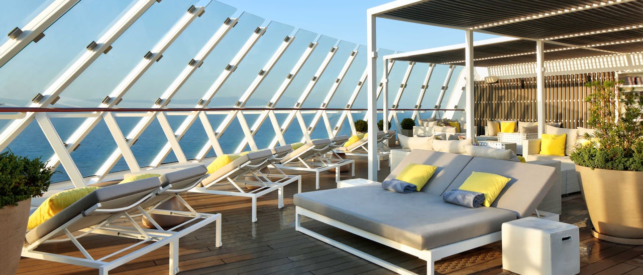 Op het pooldeck, met onder andere het solarium en het zwembad onder een glazen dak, vind je een buitenzwembad en de Rooftop Garden. Dit gebied, ontworpen om te ontspannen met houten sculpturen en groene vegetatie, biedt een absoluut unieke sfeer.